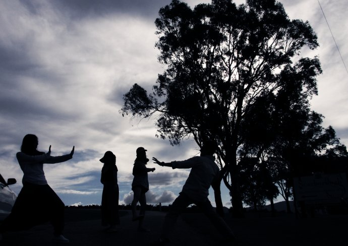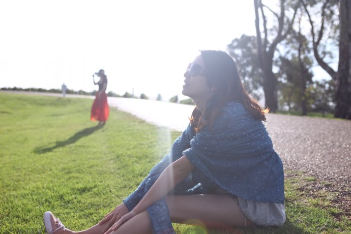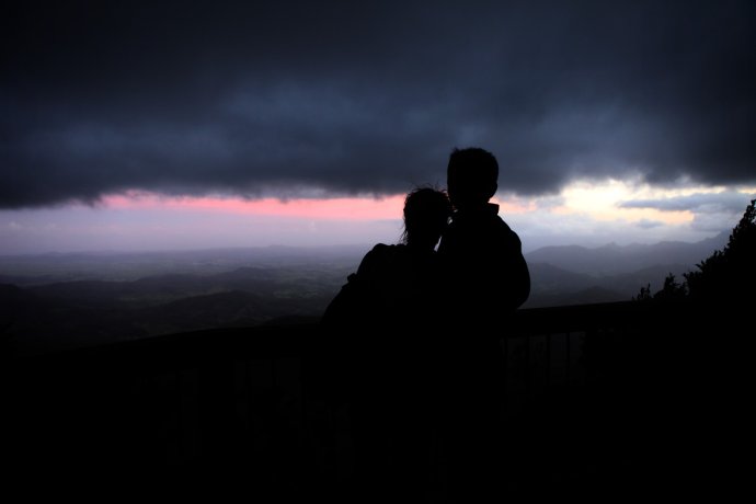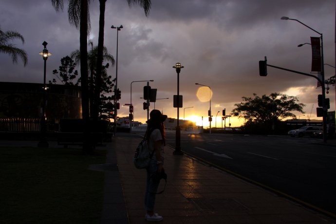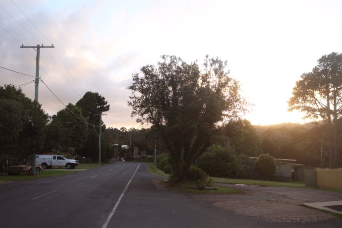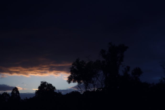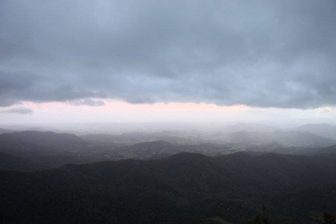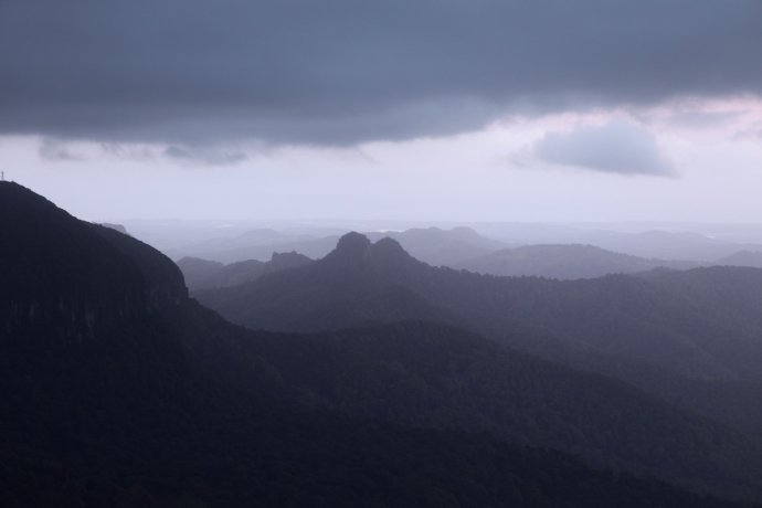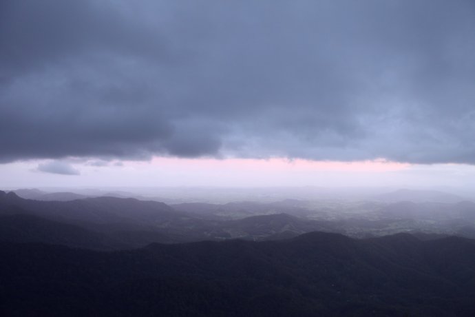 Our GPS only took road names; we entered Springbrook Road—about 40 km. We thought 40 minutes, so we shopped for dinner and left unhurried—wrong call. Much was narrow mountain road; unfamiliar terrain and caution slowed us. We chased the sunset. The park felt raw; few signs; occasional cars and houses proved we weren’t lost; a kangaroo or two bounded by. Locals say if you hit a kangaroo (they’re overabundant), you can take it home—though who could eat such cuties? There were several lookouts, but we wanted “Best of All.” From car park to the lookout, 350 m of boardwalk. We sprinted like a 100 m dash—only later realizing we ran a forest path in near darkness—risky! We still missed the sun by ten minutes—just a blush behind dark clouds, like an ink wash painting—beautiful and bittersweet. One sunset shot caught on the way.