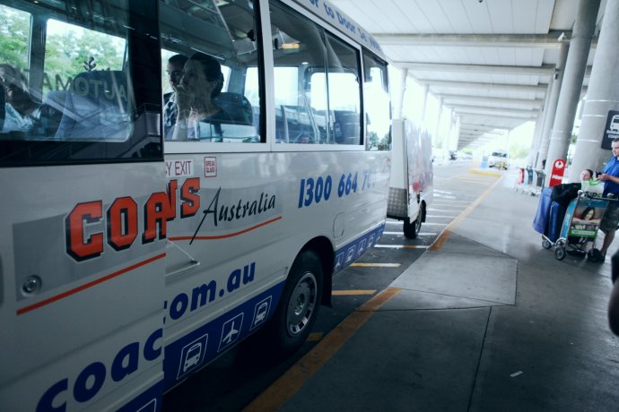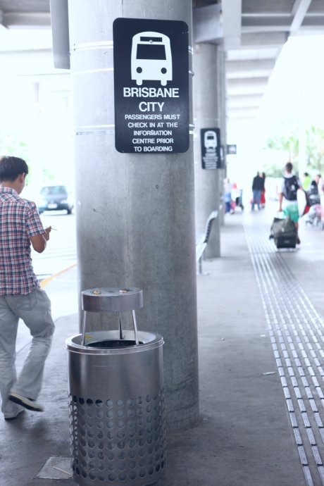 After 14 hours, we landed in Brisbane after 6 am. Brisbane is two hours ahead of Beijing. We found the “i” info desk, asked how to get to our hotel, and bought the airport coach—AUD 16 pp, about 30 minutes. Drivers check your hotel address and drop you right at the door—so thoughtful. Waiting for the coach outside the terminal.