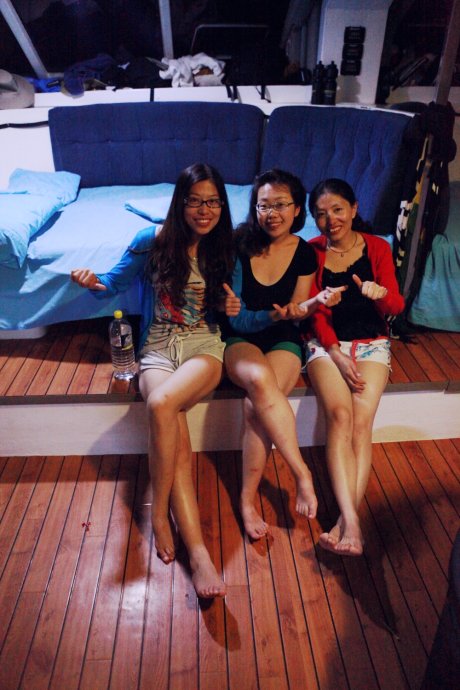 Full and happy, we strolled back through a town lit like a floating palace—the nightlife just beginning. But we turned in—tomorrow’s sail awaits. 【Day 8】 2011.01.31 New Year’s Eve. My first time on a liveaboard—jitters and joy. We stored luggage, checked in at 8:30, filled health/swim/English forms. Our skipper Richie briefed safety, and at 9 we boarded with 22 other guests. In the harbor, the sea was glass—once outside, the swells slapped the bow. We sat up front, screaming as spray drenched us—like a pirate ship ride, ocean-style.