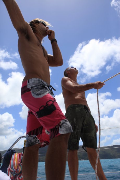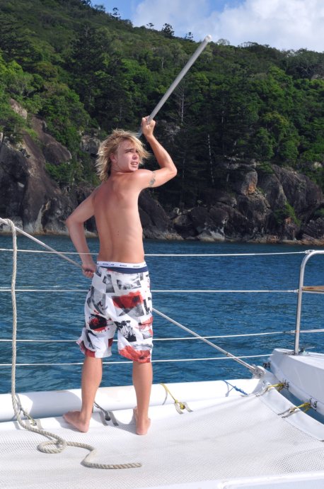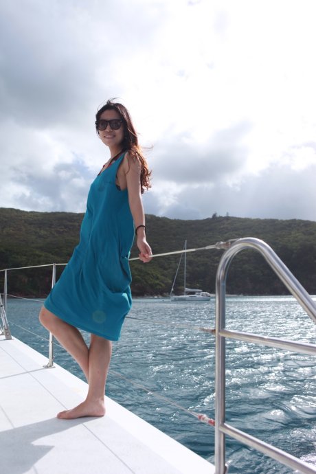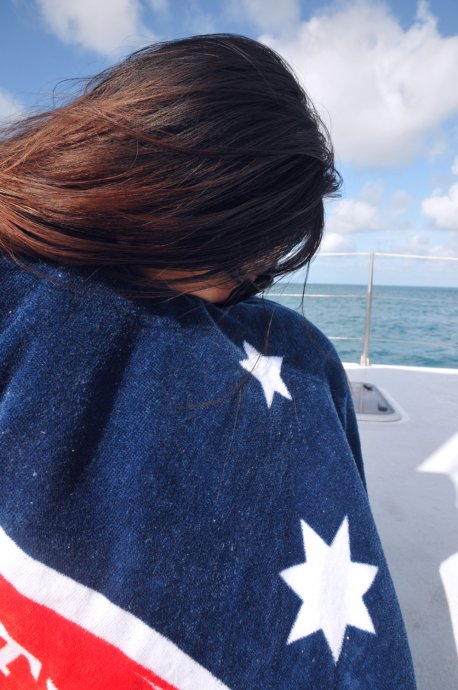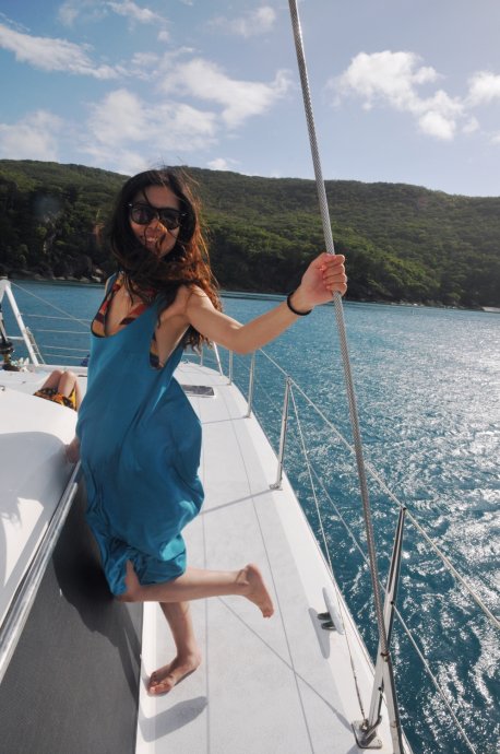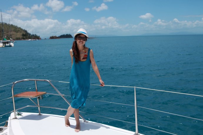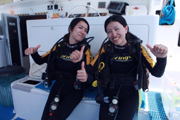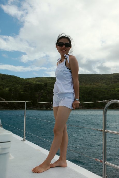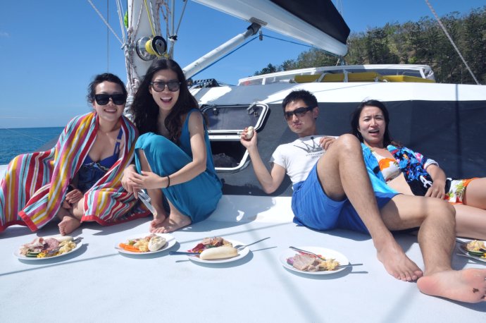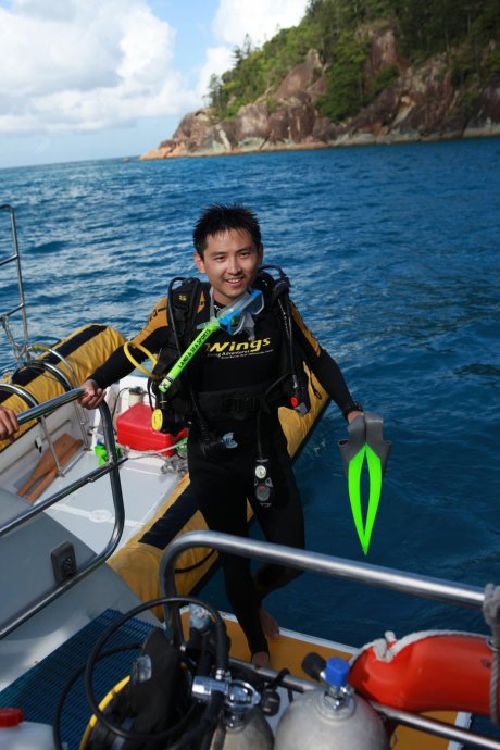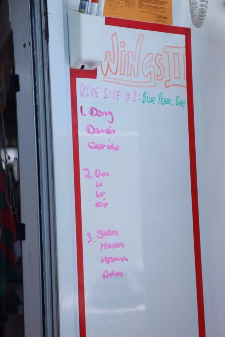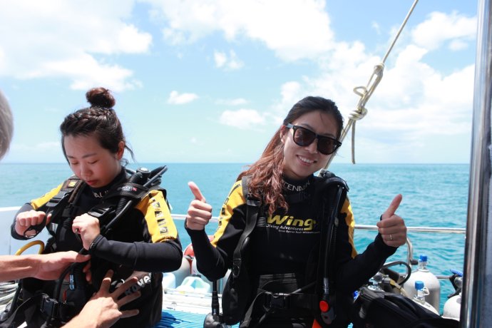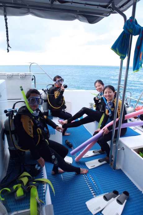 Three handsome styles: Richie—witty Brit with a Danish girlfriend, curious about China; Dyllan—quietly cool, then a killer smile; Ben—sunny and simple, serving up deliciousness. We were smitten. After two hours we reached Blue Pearl Bay for our first dive. We’d booked the package—AUD 340 pp incl. 5 meals, 1 night, 2 dives. Others could snorkel for free. We were in the second dive group; while waiting, we had a little photo fun.