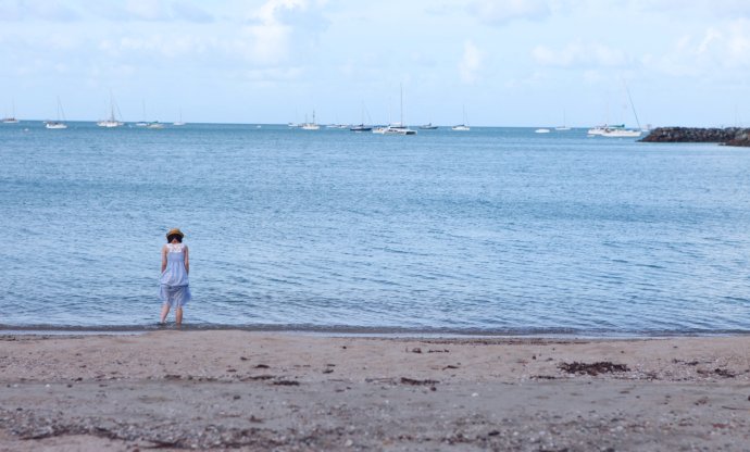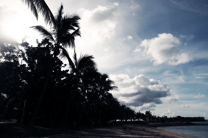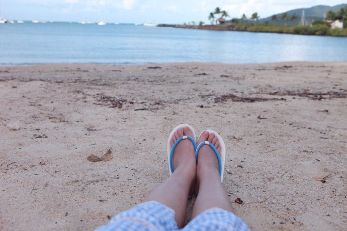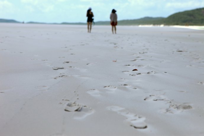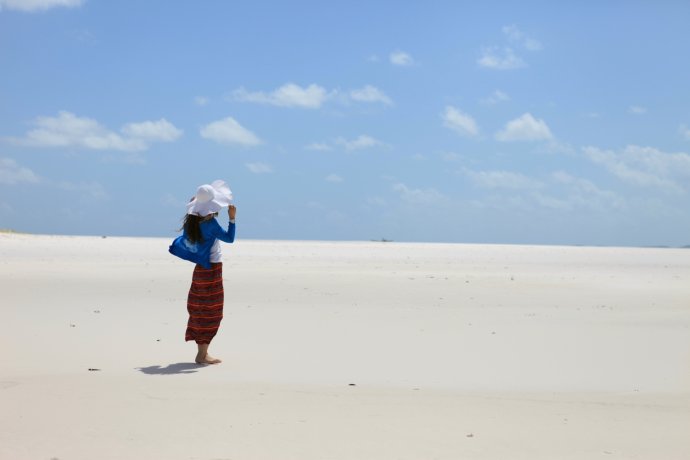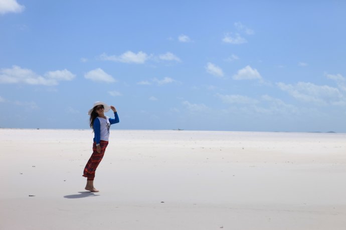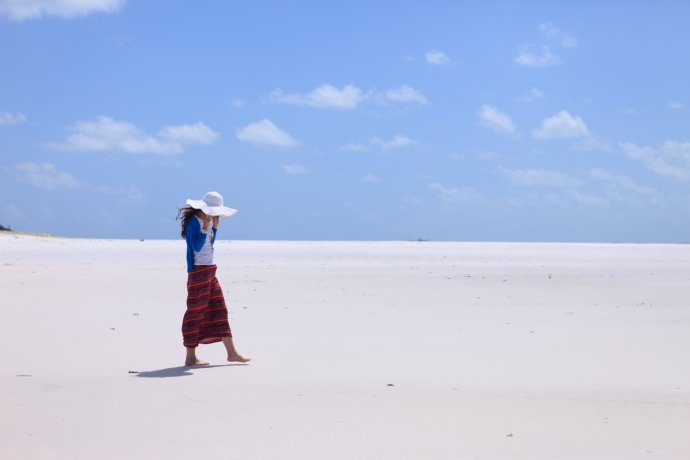 Over the hill—and we were stunned. Heavenly. Pure white sand, dazzling; shoes off, skin to nature. Powder-soft; black flecks were coral remains left by the tide.