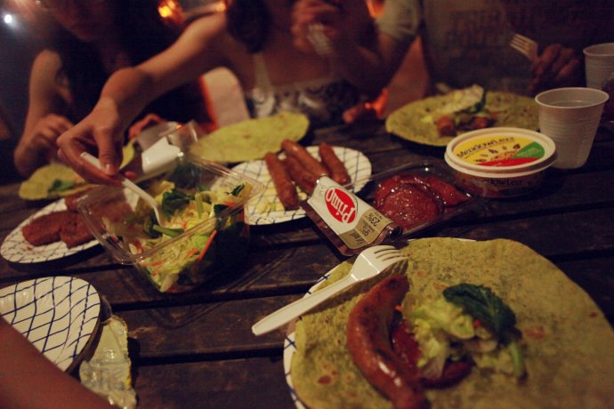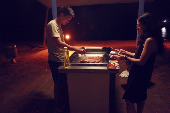 Our “casual” dinner peaked at the public BBQs—free electric hotplates. Bring your food, push the button, and clean up after. We made Mexican-style wraps—grilled meat and veg in tortillas—eaten by the sea with distant guitar music. Talking or staying quiet both felt perfect.
