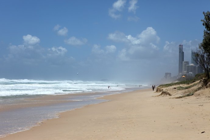 Minutes later, we met the Gold Coast we’d imagined—surf pounding Surfers Paradise. No gear, so we waded and braced for waves—ready to be drenched.