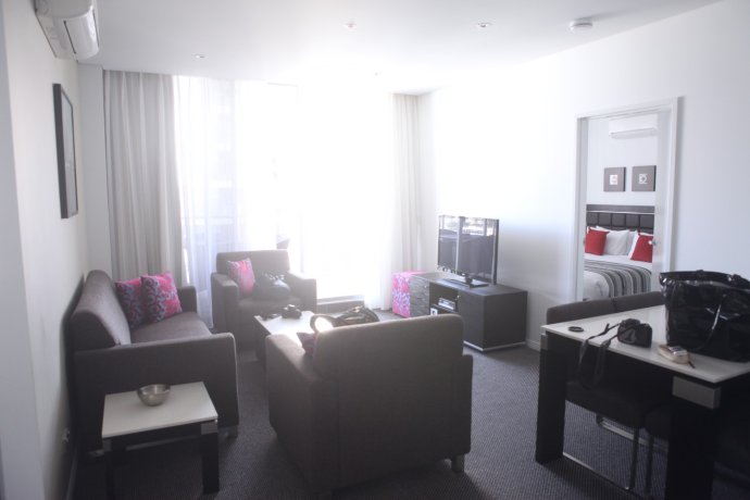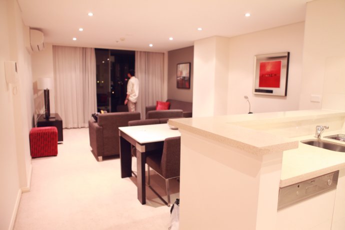 Dusk fell; we headed to Meriton in Parramatta (West Sydney) on George St—three nights in a 140 m² duplex. Cheap because Parramatta is “rougher,” they say, but the front desk guy was lovely and the place felt like home.