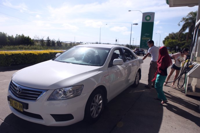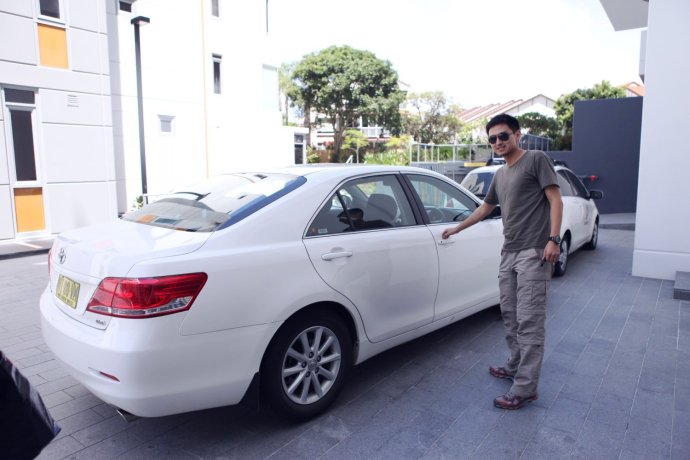 Our self-drive began morning Dec 25. Dong Ge & Bubble landed early, grabbed the AVIS car at the airport, picked up Nic, then us. Our car: Toyota Corolla. We worried it’d be tight for 5, but it drove great—flat rear floor made the middle seat comfy; trunk just right. Australia drives on the left—right-hand drive—takes a bit to adjust. Besides Dong Ge, only I had a notarized license to sub. A GPS is essential; rental GPS is AUD 11/day. We had a Chinese map on our unit from Taobao—surprisingly decent. Our route: drive the East Coast. Day 1: Brisbane to Gold Coast (~90 km). The skyline meets a 30+ km golden beach, theme parks and Movie World, and canal villas with private moorings. Our “Little White Corolla” and our beloved driver “Dong Ge.”