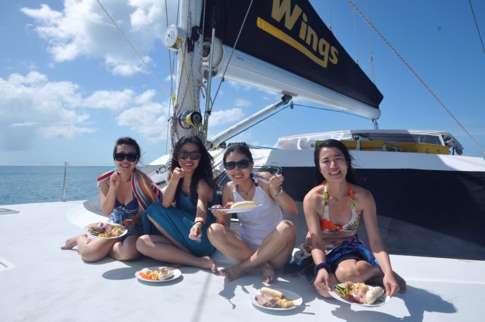 We checked in for our sail with the “Wings” company—the blue décor was cool, but the front-desk gal stole the show: energetic, expressive, infectiously happy. We wondered where her daily passion comes from—maybe the magic under the sea. We’re even more excited for two days offshore.