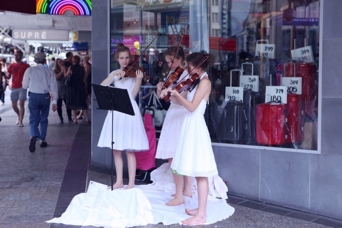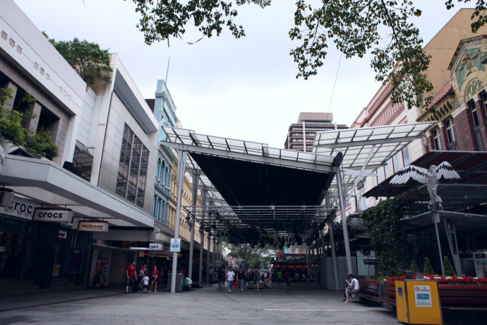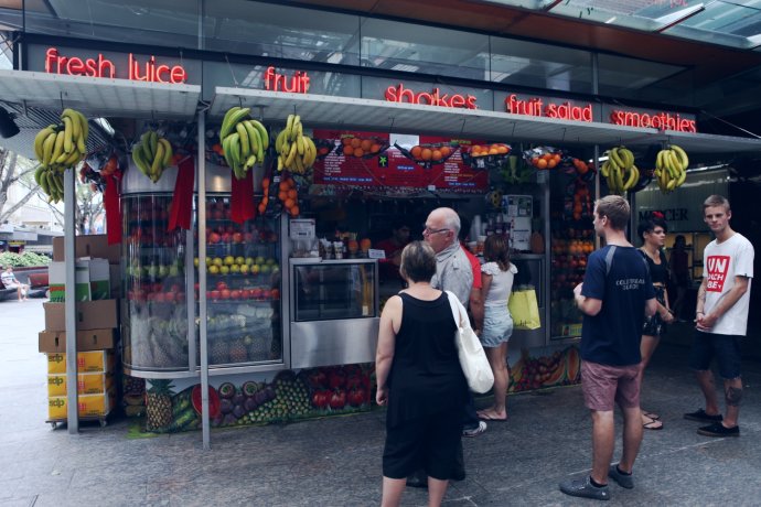 Queen St. mall is two blocks from the hotel. Check-in was at 2 pm, so we stored bags and wandered the CBD. Australia is rich in fruit. We grabbed fresh juice—AUD 5.5 a cup.