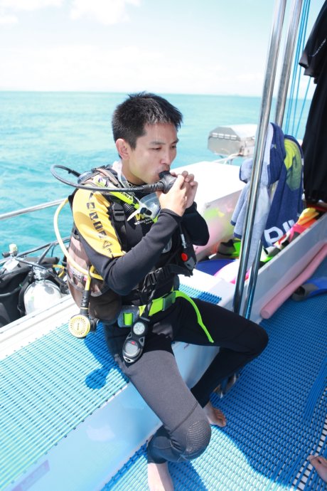 Time to dive. We four can’t swim and had never dived—excited but scared. After mouthpiece drills, Tutu mom bowed out—panic breathing through the regulator. Richie regretted it but took us three down. First dive was short; nerves, dry mouth, ear pressure—we clung to Richie and barely noticed the sea’s beauty.