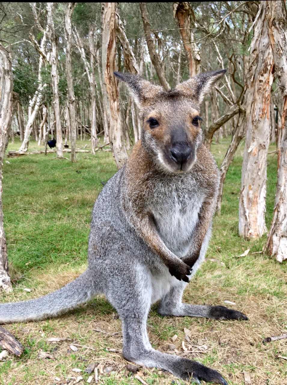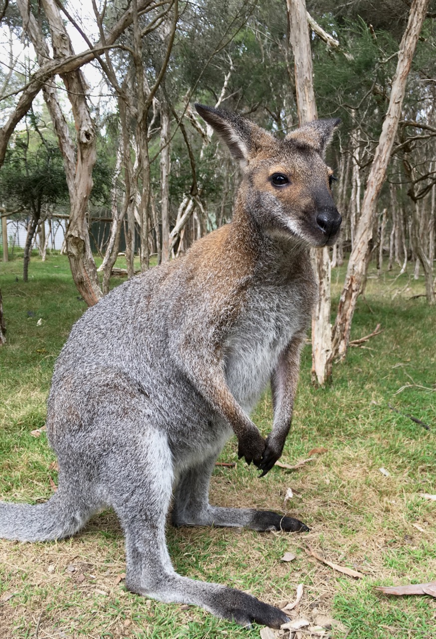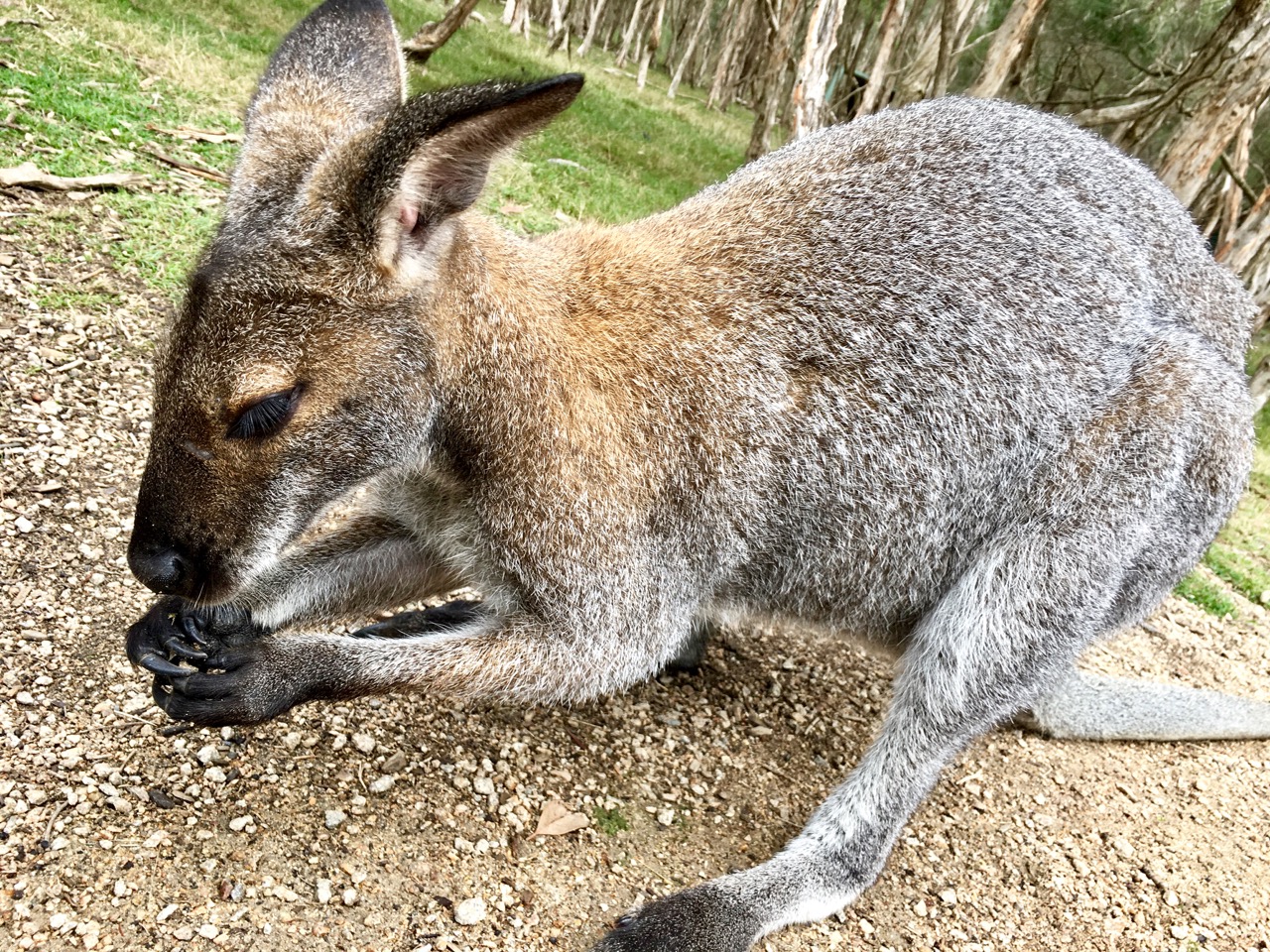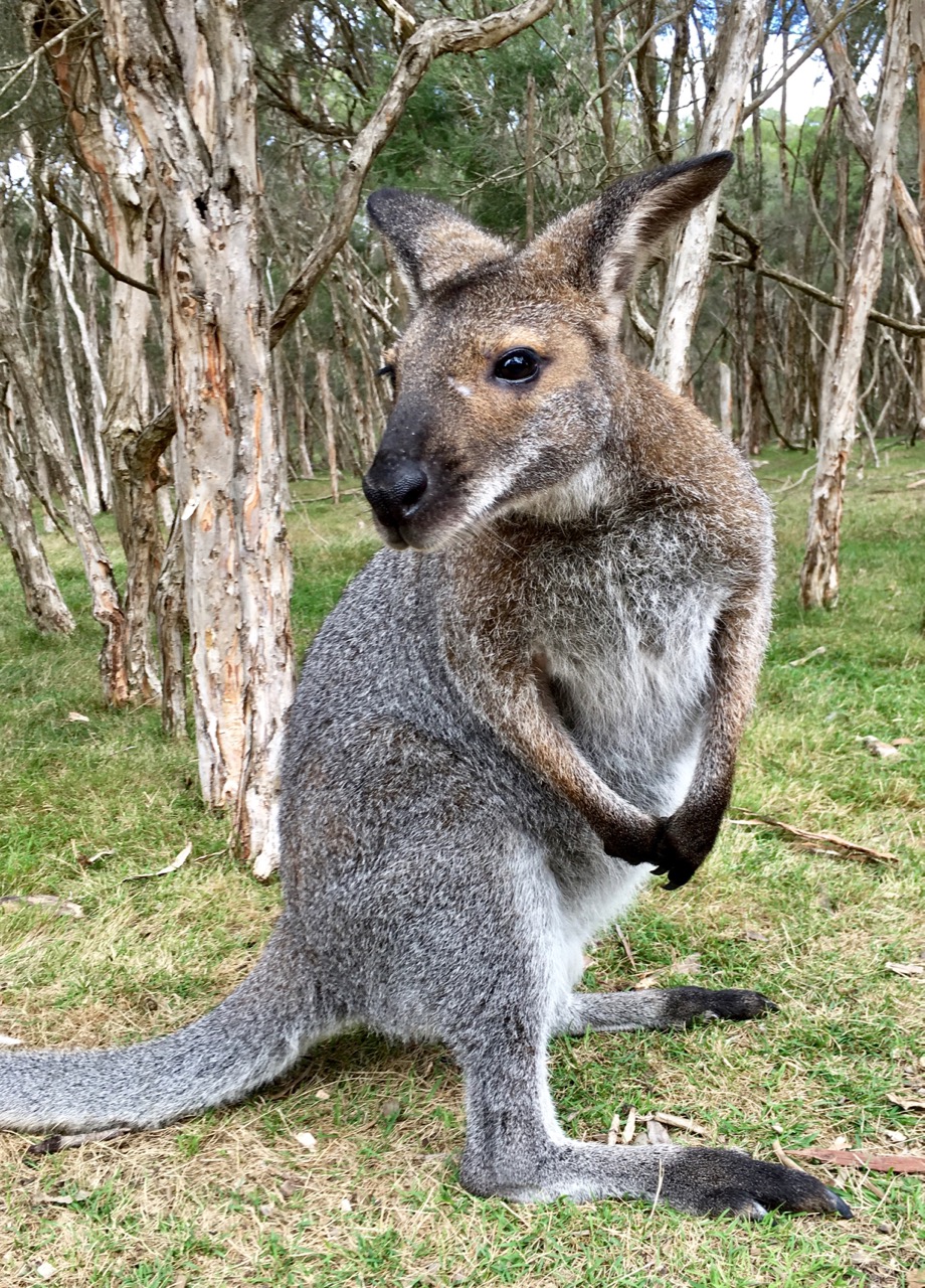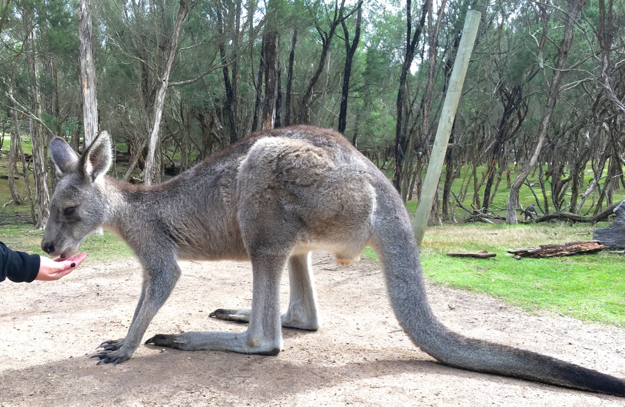 Adult kangaroos are wary and less food-motivated; they keep their distance. This one’s probably a male—stood up as tall as a person, so I didn’t dare get too close.