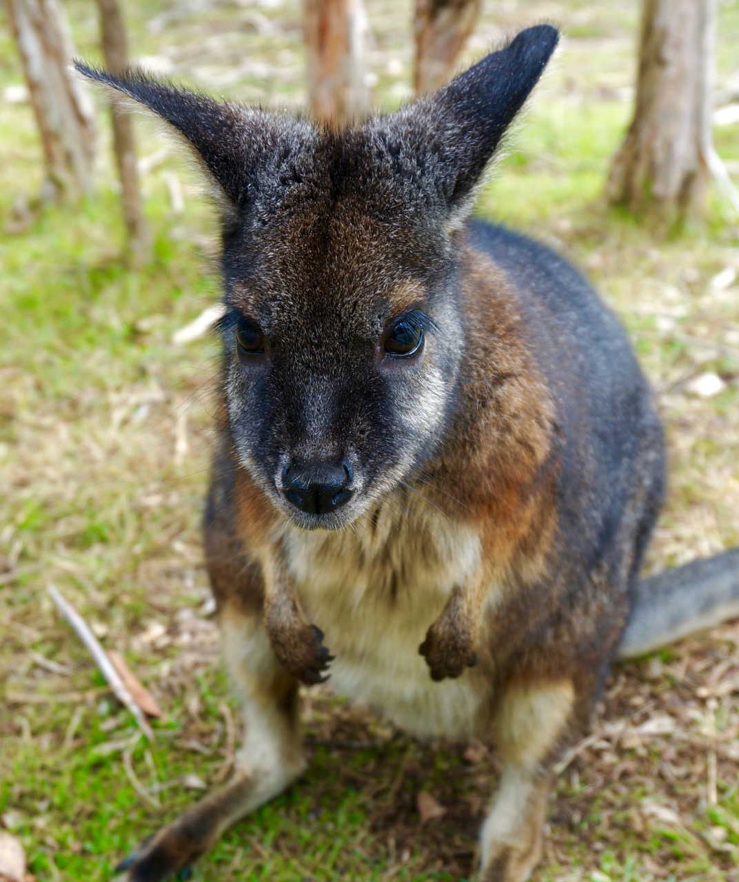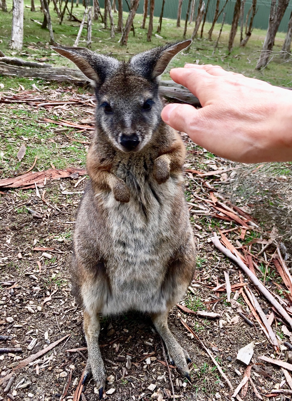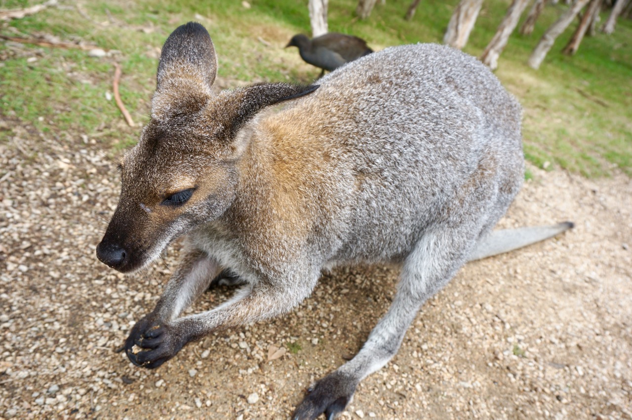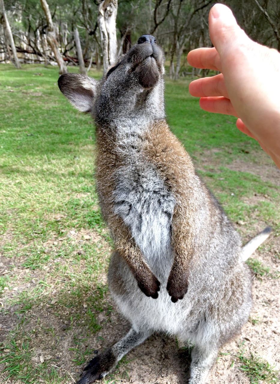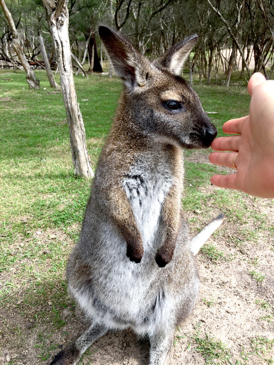 Adult kangaroos are wary and less food-motivated; they keep their distance. This one’s probably a male—stood up as tall as a person, so I didn’t dare get too close.