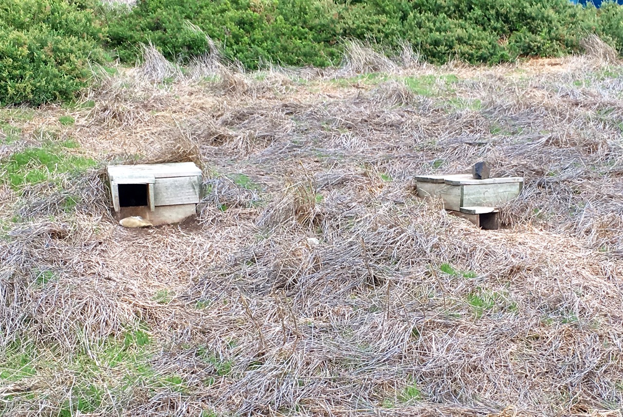 On the slopes by the sea you’ll see lots of little wooden boxes—penguin “villas.” Each box houses a penguin family.